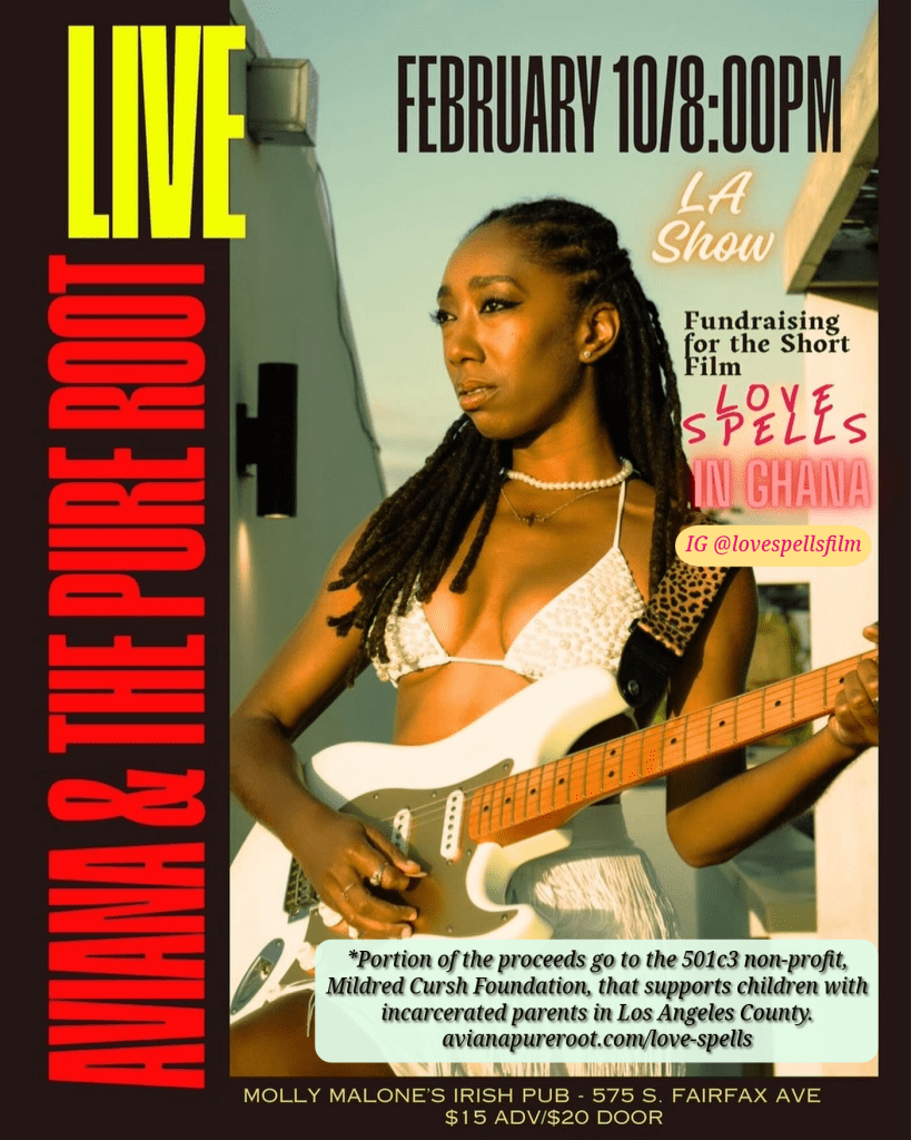 Join us for our final fundraiser show for Love Spells before we head off to Ghana next month! We will be shooting the final two videos for the film in Accra, Ghana. See you at Molly Malone’s on Saturday, February 10th at 8pm! Click here to purchase tickets: https://hub.seetickets.com/us/event/8-20-pm-aviana-and-the-pure-root/molly-malone-s/2930784